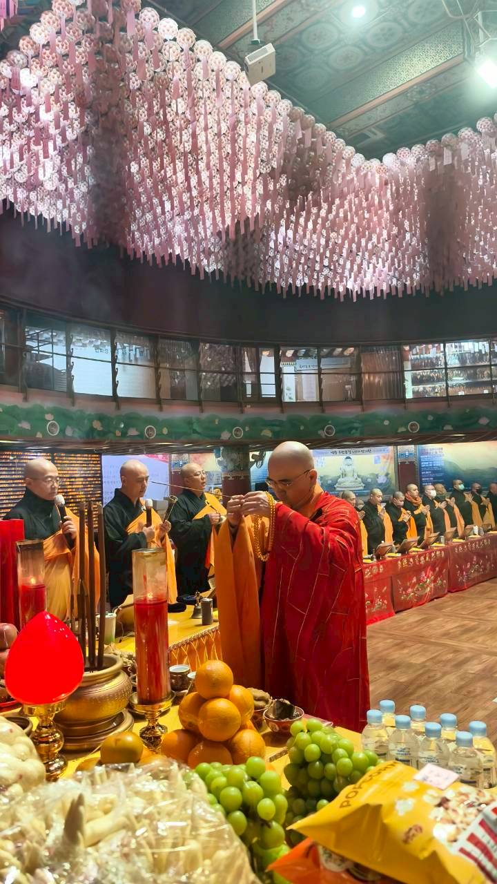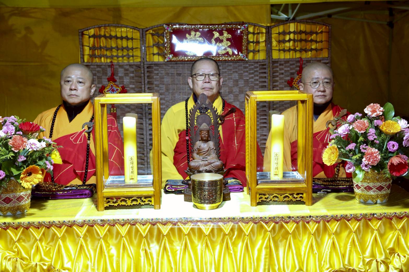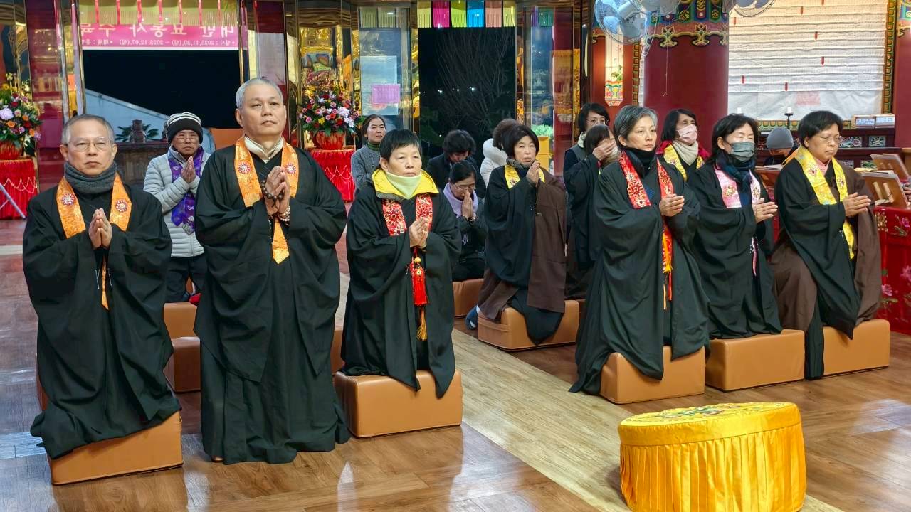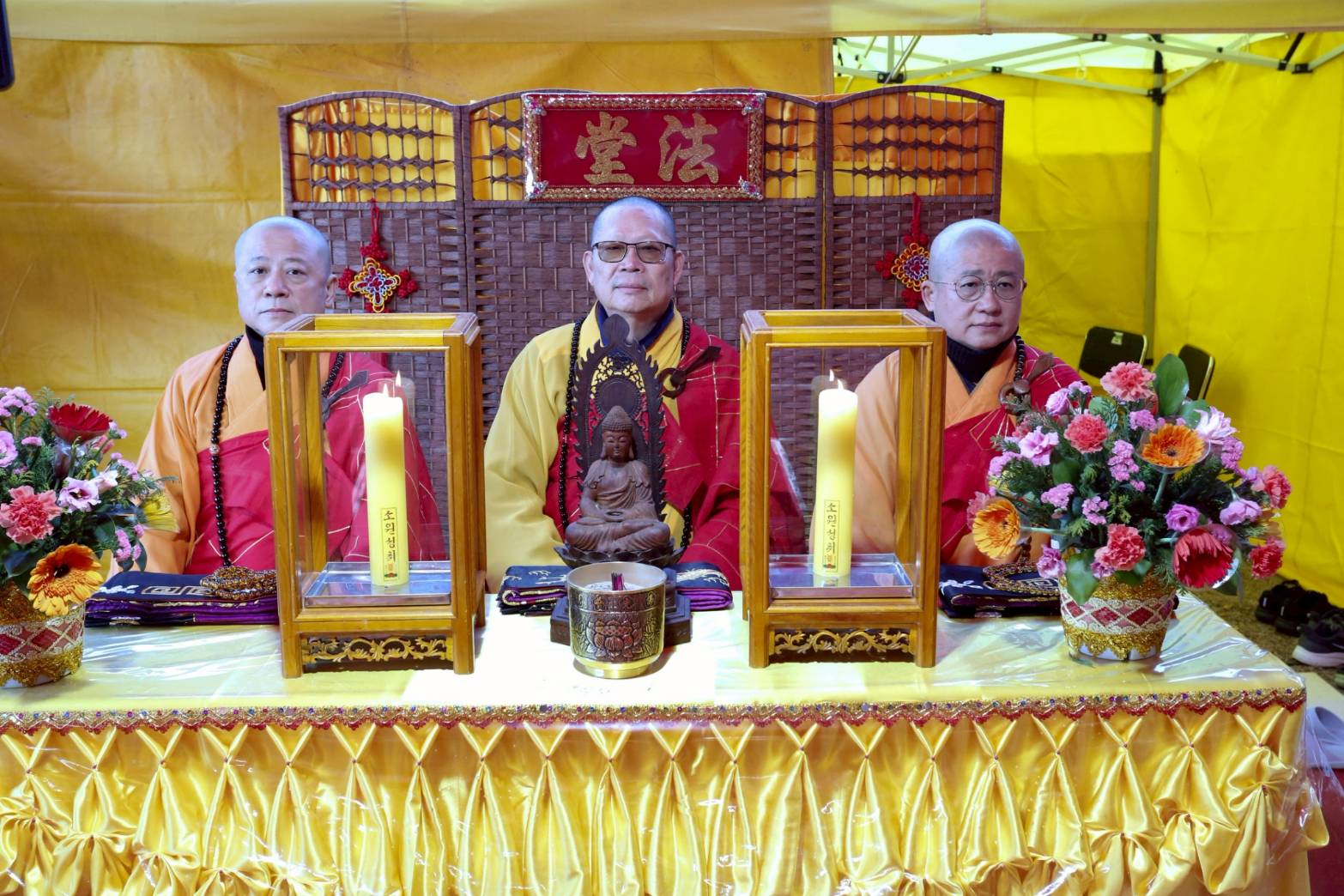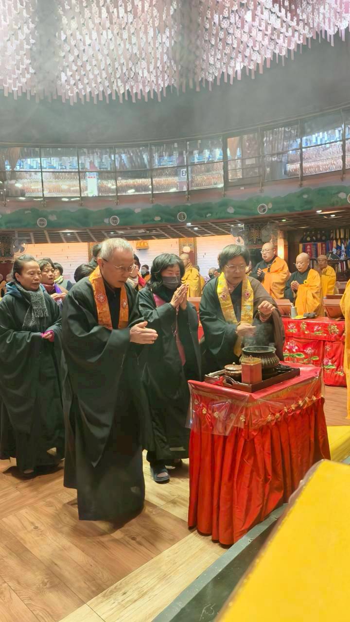 入壇已。三位主法和尚、上傳下敦師父和齋主依序拈香。