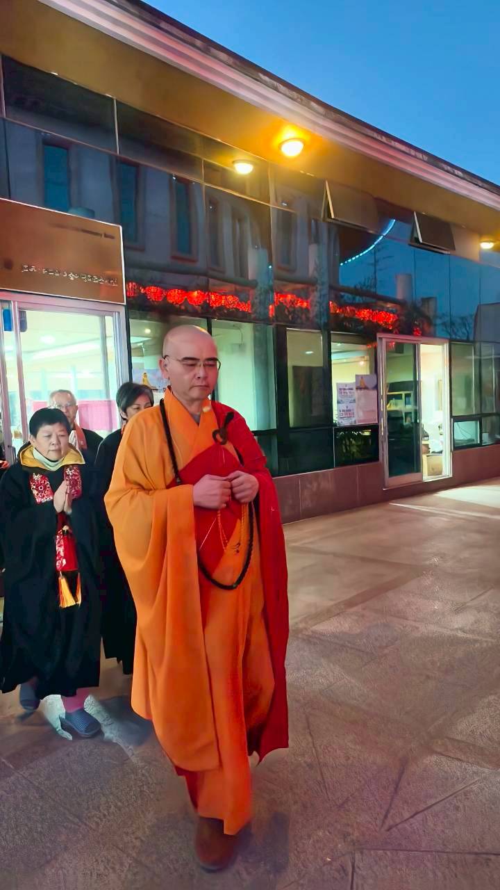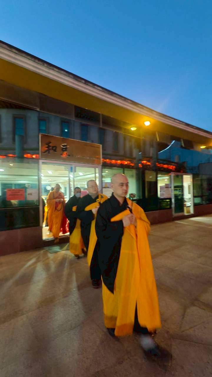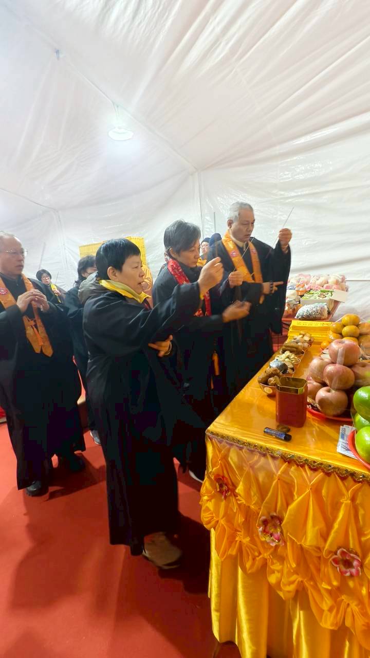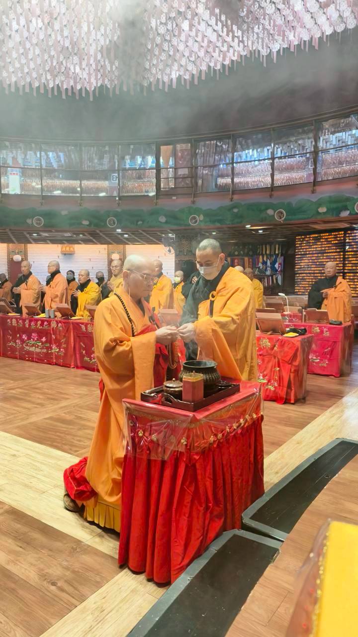 六塵妙供圓滿,大眾諷誦《八十八佛懺悔文》,念至第四句,正表、副表執手爐,主法、上傳下敦師父、齋主出位上香。