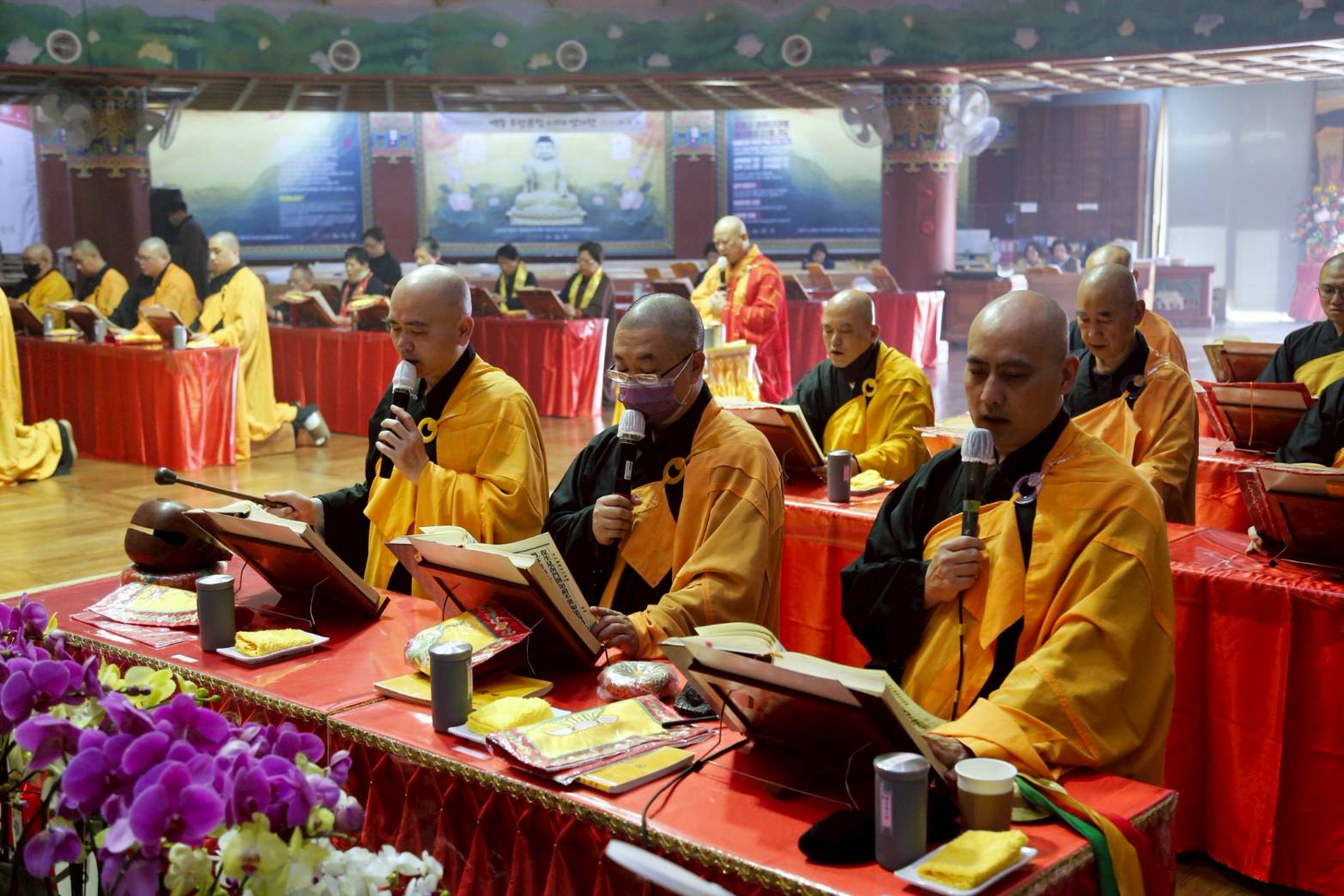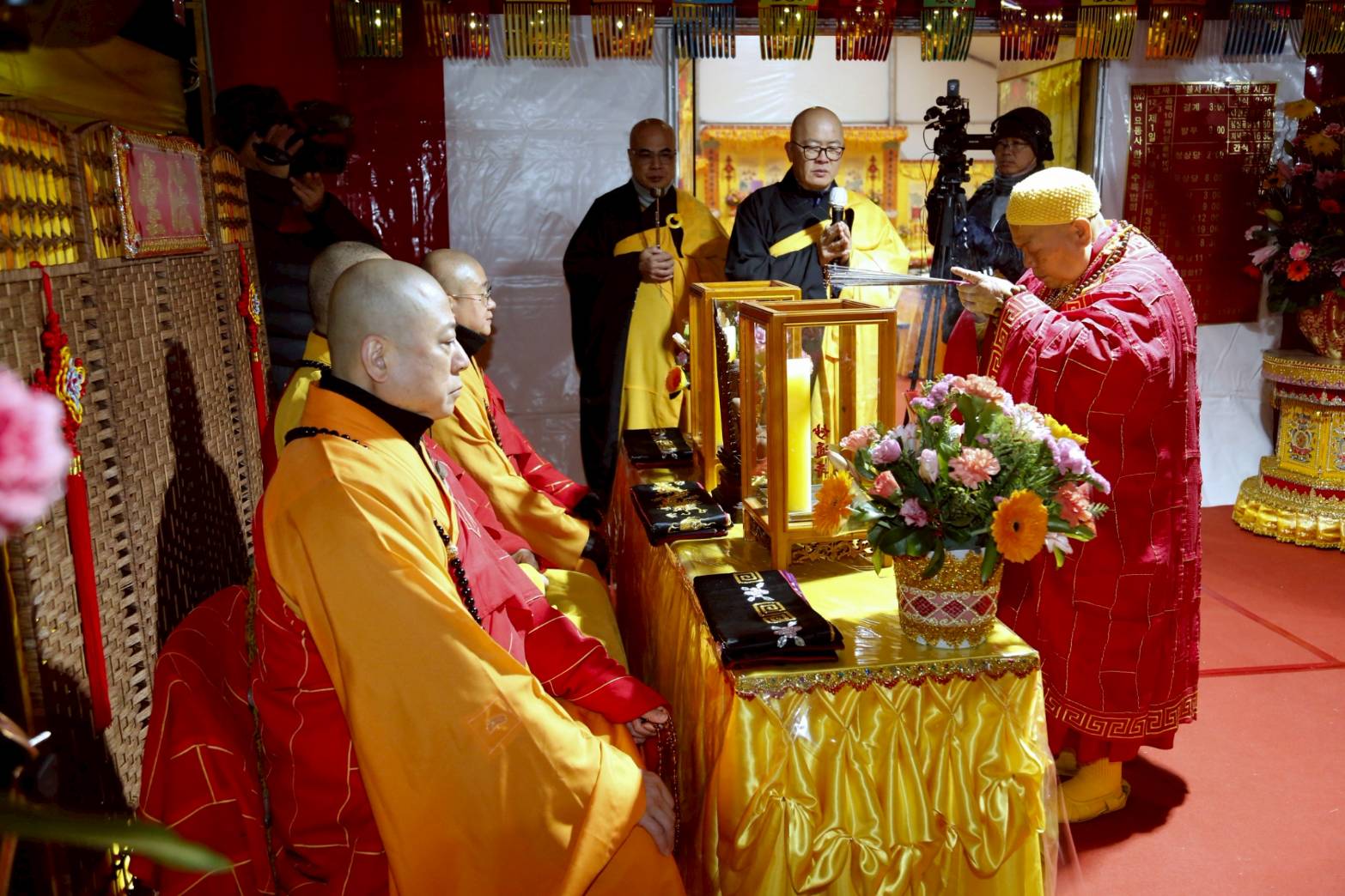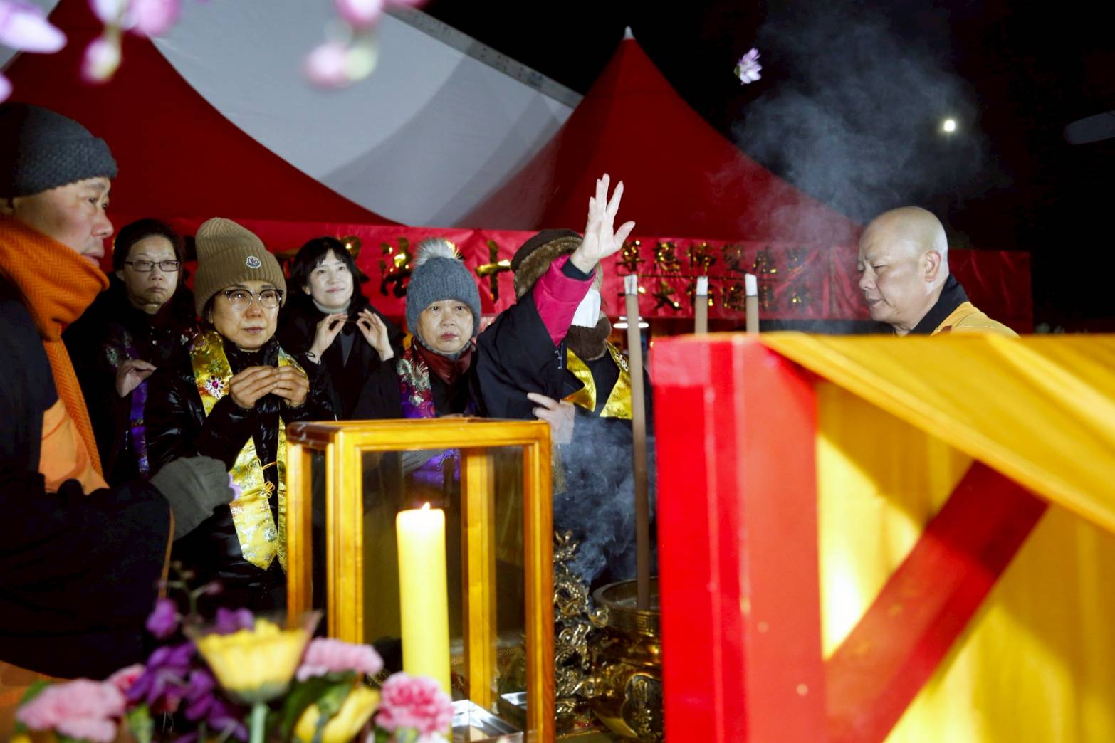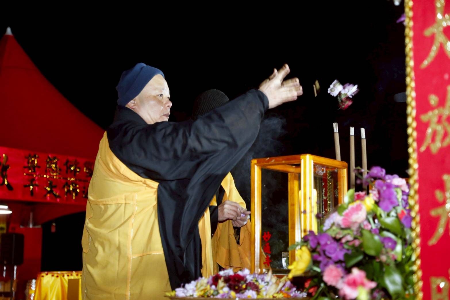 誦獻華真言時,兩位香燈持花盤於10席散花。