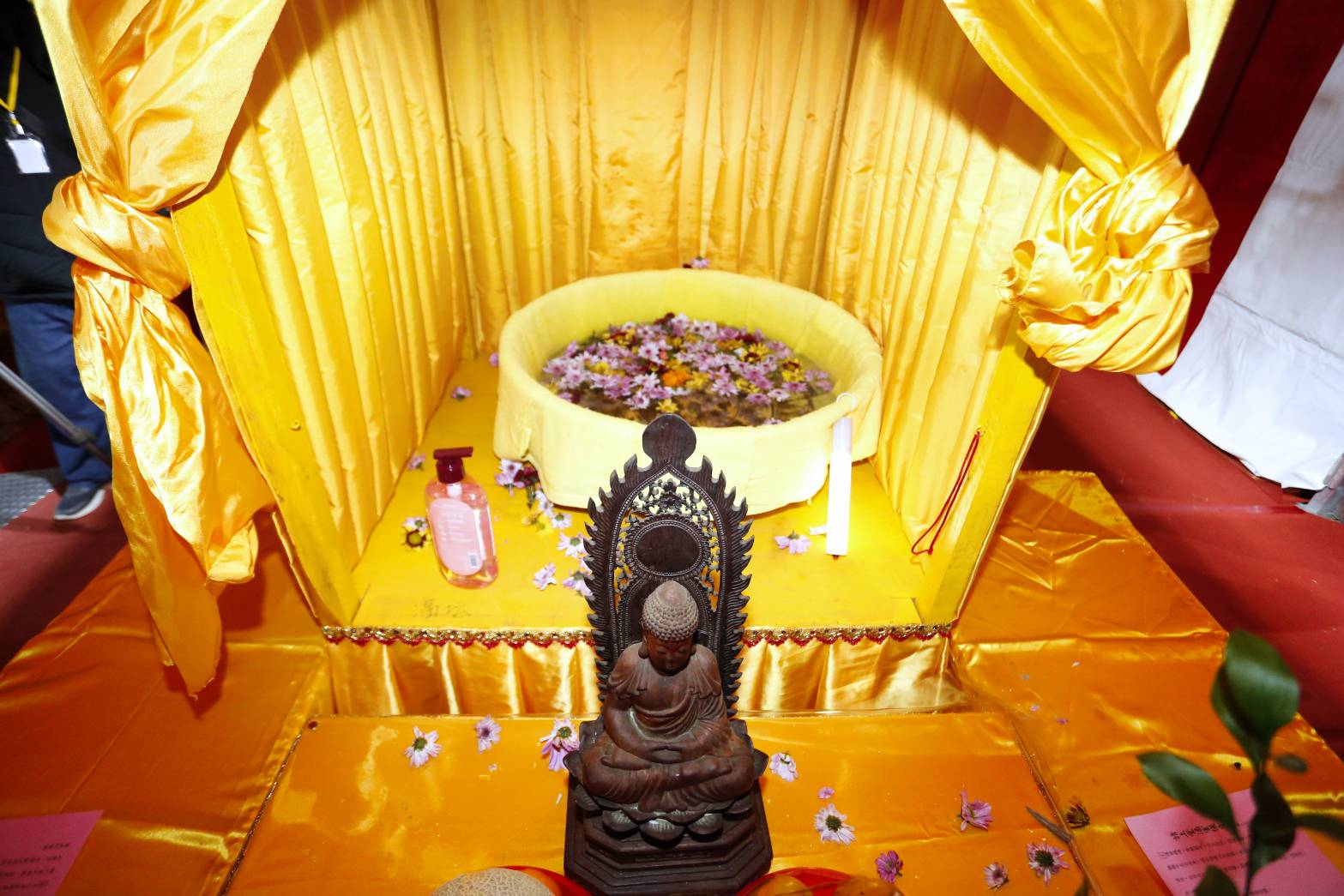蓮華藏海。當體圓成。流泉浴池。隨處顯發。湛湛兮八功德水。巍巍乎五分法身。須知諸佛元不洗塵。為欲眾生皆令離垢。想見受茲灌沐。夜月之印澄潭。現諸威儀。朝曦之升遠漢。敬宣密語。請濯溫泉。用表法門。不壞世諦。我佛如來有沐浴真言謹當宣誦。(香燈化佛衣)