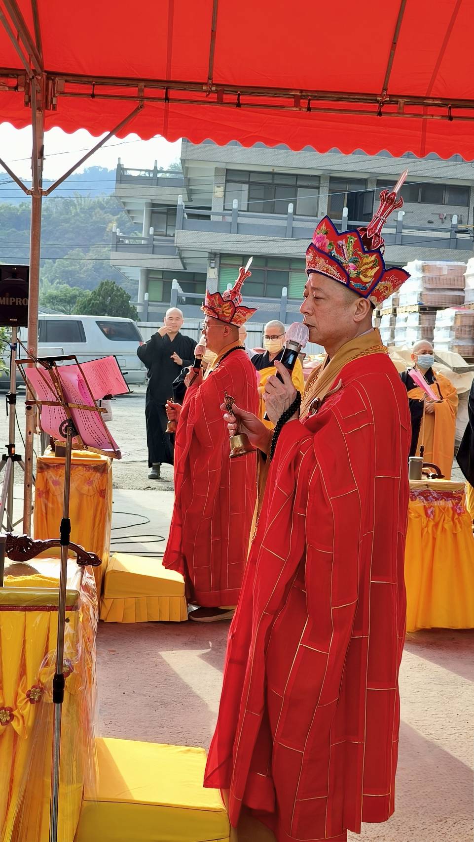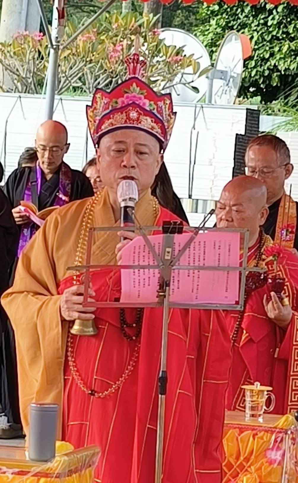 主法和尚宣:「啟建法界聖凡水陸普度大齋勝會道場證盟功德文疏」。宣疏時齋主出班拈香。