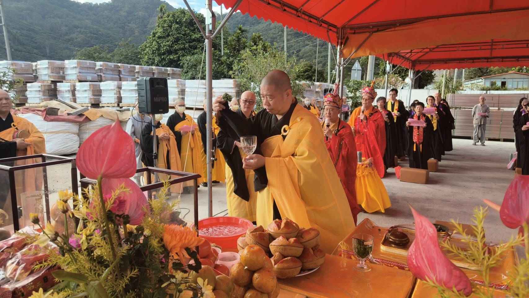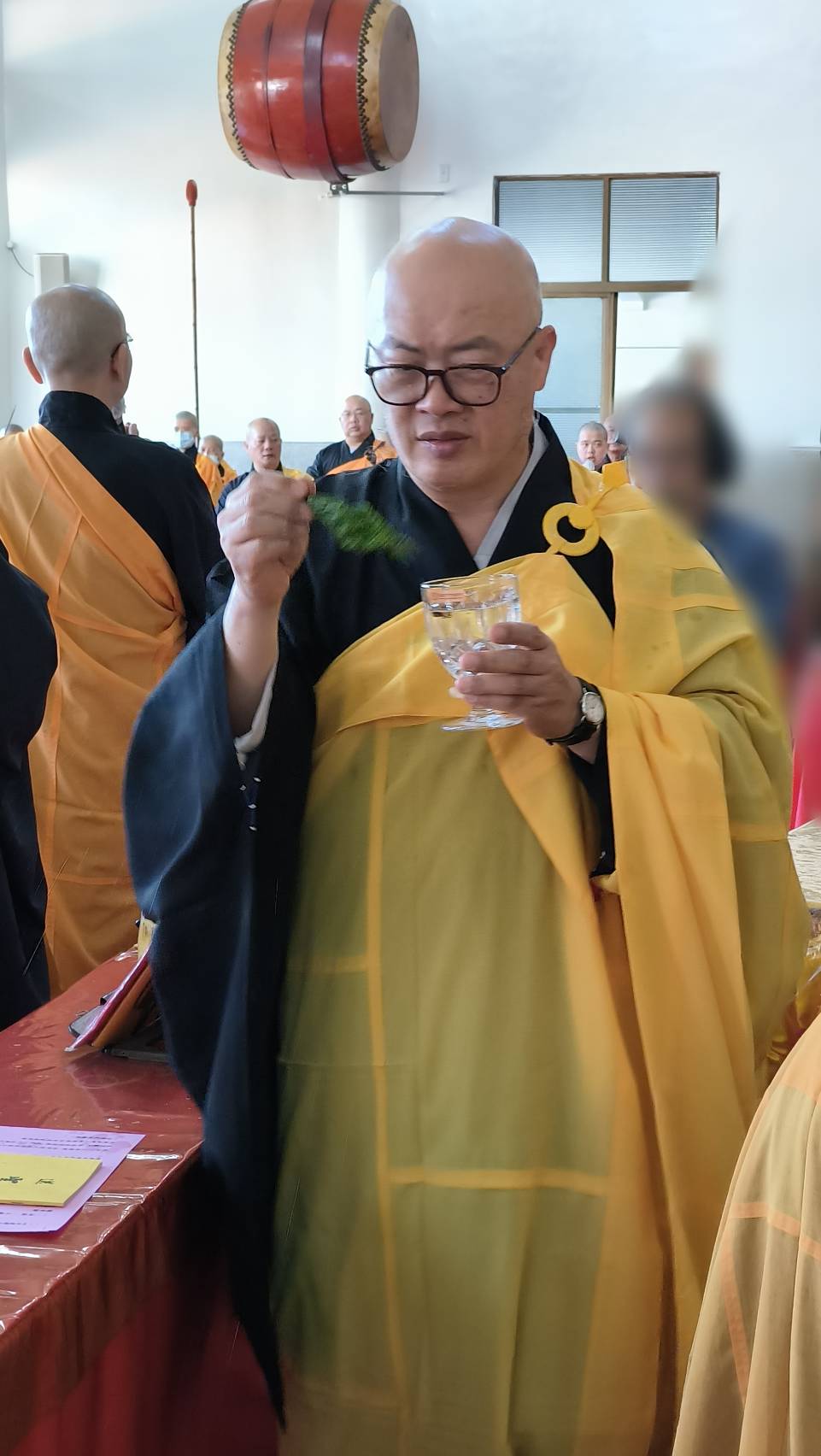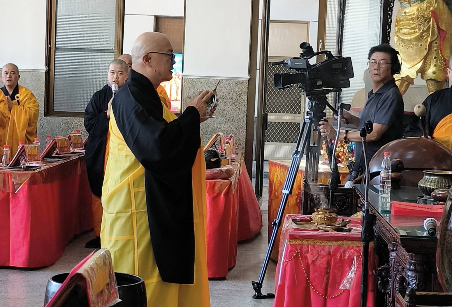 香燈持水杯灑水於供品上。