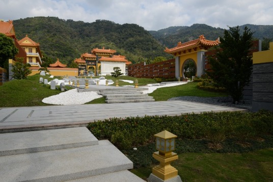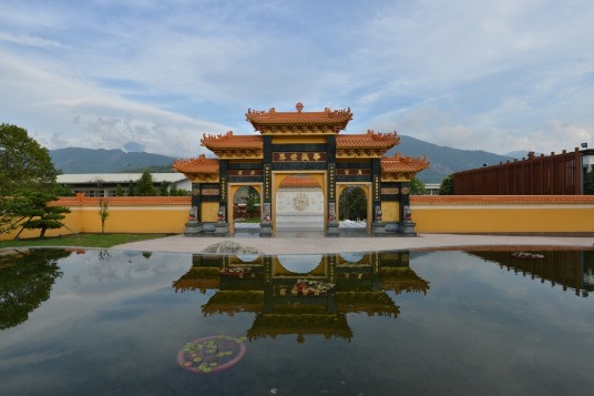 東軸線龍邊的蓮花池庭園,清涼舒暢綠意盎然,一旁的蓮花格柵,上嵌圓形大明咒,典雅別緻,為進入「毘盧樓閣」的參道入口。參道之名緣於古人欲覲禮參拜佛祖,一路朝山跪拜祈求,故名參道。毘盧樓閣參道由天然岩石砌成,由此依山勢緩緩呈「之」字型拾階而上,步步高昇,兩旁庭園,景緻怡人,禪味滿滿。經過佛說十法界圖與十善惡業文照壁、毘盧樓閣山門,豁然可見金碧輝煌的毘盧樓閣巍峨聳立在藍天白雲下,倒影在綠野亭閣水池間,氣勢恢弘,輝煌壯麗。